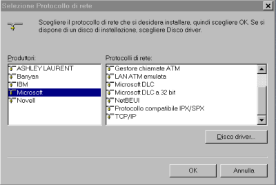 e, cliccando sul tasto Aggiungi, si aprirà la seconda finestra. Scegliendo la voce Protocolli si passerà a una finestra successiva in cui scegliere la voce Microsoft e, successivamente, il protocollo TCP/IP: