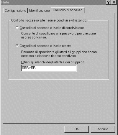 Va indicato, o modificato, il nome del computer e l'eventuale Gruppo di Lavoro. Il Gruppo di lavoro in una rete piccola può coincidere con l'intero dominio; in una rete estesa, può invece indicare un gruppo preferenziale di computer con i quali vi sono maggiori condivisioni di risorse. Un dominio, ovviamente, può contenere parecchi Gruppi di lavoro. Il terzo spazio può ospitare una descrizione del computer. A questo punto, si passa alla terza sezione, indicata dall'etichetta Controllo di Accesso:
