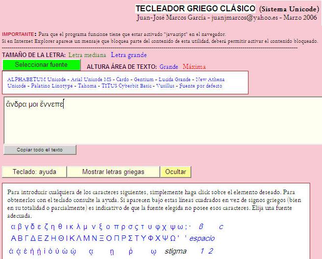 Si può scrivere, molto agevolmente, dopo aver attivato il pulsante Mostrar letras griegas, selezionando la lettera prescelta già combinata con spirito e accento ad hoc, con un click del mouse su di essa oppure utilizzando direttamente la tastiera (a= aplha, b= beta etc.). Per i segni diacritici da tastiera, con le parentesi tonde si hanno gli spiriti: ( = spirito aspro ) = spirito dolce. Iota sottoscritto: si ottiene premendo dopo la vocale Shift + | (barra dritta/pipe). Accento: